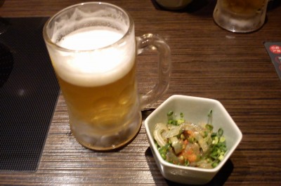 まずはお通しの湯引きとビール。