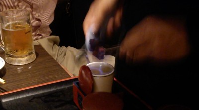飲み放題なのに、ひれ酒もアリです。店員さんがテーブルで火をつけてくれます。ふたをしてしばらく蒸します。