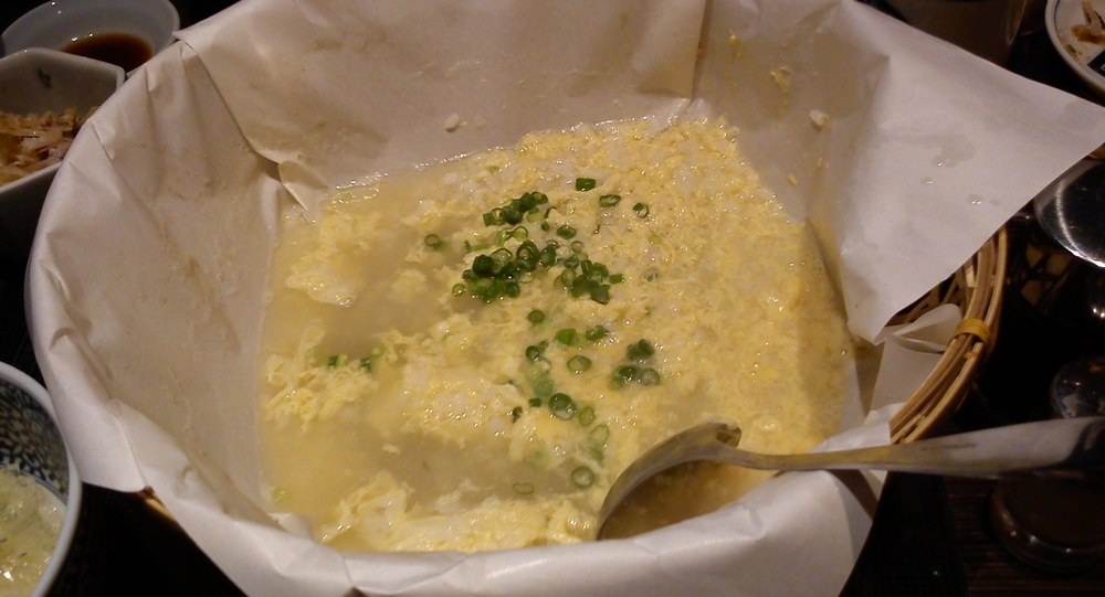 〆は雑炊。ふぐの出汁が効いていて、淡白ながら美味しい・・・はずなのですが、お酒のせいで微妙な味わいはもはや良くわかりません(・´з`・)。