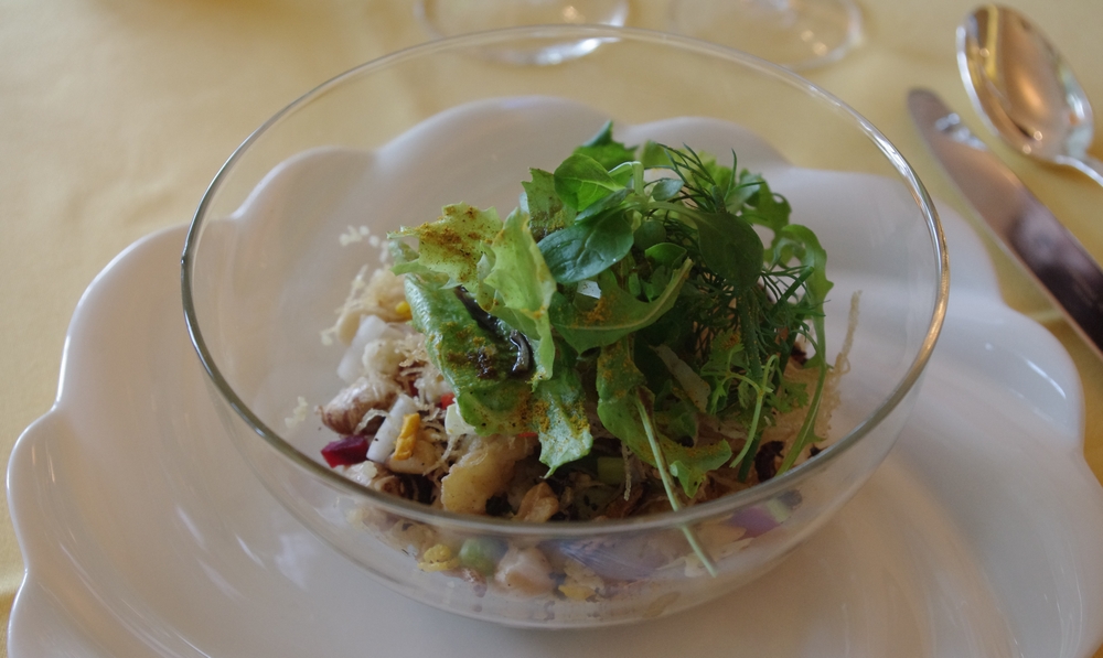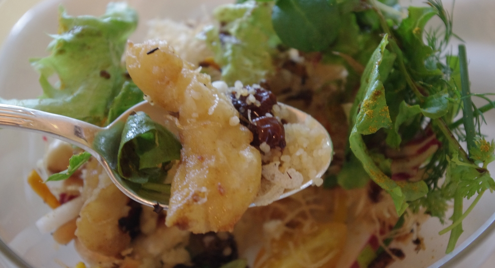 中にはちゃんと白身魚のフリッターが入っています。70種全部はわかりませんが、色々な野菜が入っていました。まぁ、野菜というか豆とか根菜が多かったように思えました。百合根とか。カレー粉がまぶしてあり、クスクスが多めに入っているせいか、なんだかフレンチというよりアジアかエスニックな味わい。美味しかったのですが、魚料理としてはどうでしょうかね・・・前菜っぽかったです。