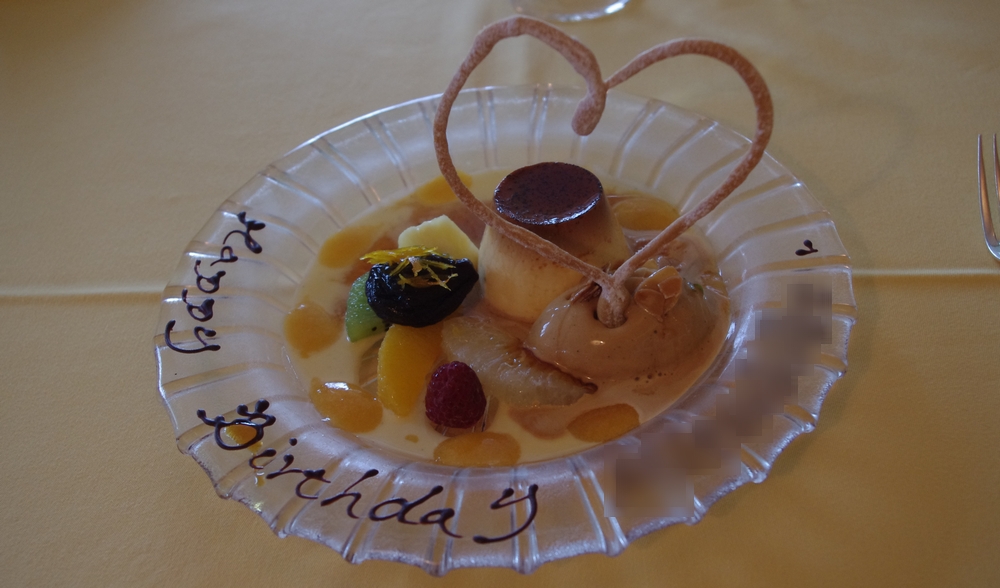デザートは「アリスのカスタードプリン」をチョイス。予約を入れてくれた隊長が、私の誕生日が近いことを伝えていたようで、お皿にハッピーバースデーの文字が・・・この後写真も撮影してもらいました。