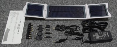 本体は開くと3面鏡のようになっており、ソーラーパネルが登場します。DC 出力は9V、10.5V、12V、16V、19Vとそれぞれに出力ポートが分かれています。他にも USB での 5.5V 出力を完備。