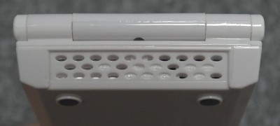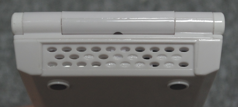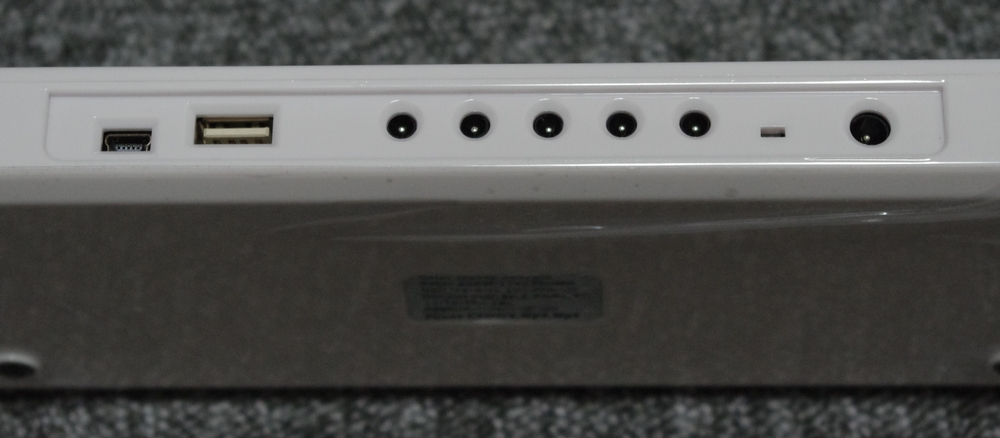 なんか、マニュアルにも Amazon の画像もここに黒いシールが張ってあって、ポートの意味が記載されているようですが、この固体にはシールがないです。一番左の miniUSB の用途はマニュアルを読んでも不明。一番右が入力用のコネクタ。その左側の小さな四角は、充電を示す赤色 LED。