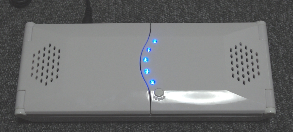・・・が、ボタンを押すと青い LED で充電残量が確認できるのですが、1つも点灯しません。最初は電源から充電しないとダメなのかな?と思い DC 接続してみました。