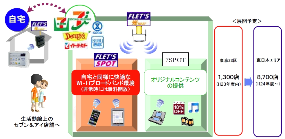 まずは都内から開始らしいですが、セブンイレブン、イトーヨーカドー、デニーズ、西武、そごうを無線LANスポット化するとのことです。サービスは NTT 東日本のフレッツ・スポットになるそうです。