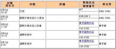 日曜日の早朝から、ステイタスが変化しません。・・・もしや、通関が夏休み!? 8/4 の午前中に逝ったのに、随分待たされます・・・