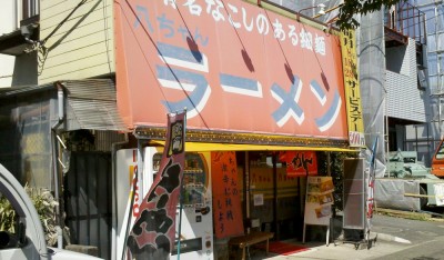 八ちゃんラーメン。二俣川から車で数キロ行った、新幹線の線路沿いにあります。8の付く日はいくつかのラーメンが激安で食べれるということですが、私は8の付かない日に行きました。昼ごはん時を少し過ぎて行ったので、ちょうど混雑が過ぎた時だとマスターが言っていました。