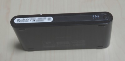 本体の横の細い部分に3つの LED と電源ボタンがあります。左側のシールにSSID やKEY が印字されています。