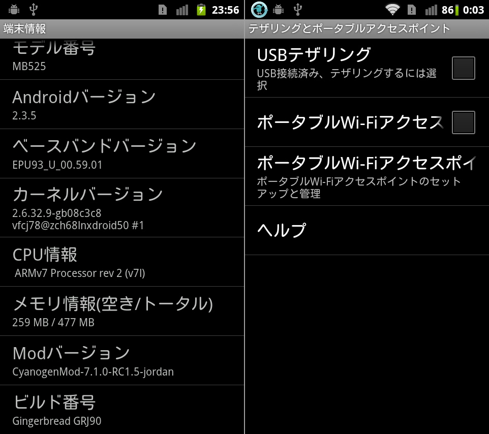 システム状態。Android が 2.3.5 ベースになっています。そして、テザリングも OK なようです。これはイイですね♪