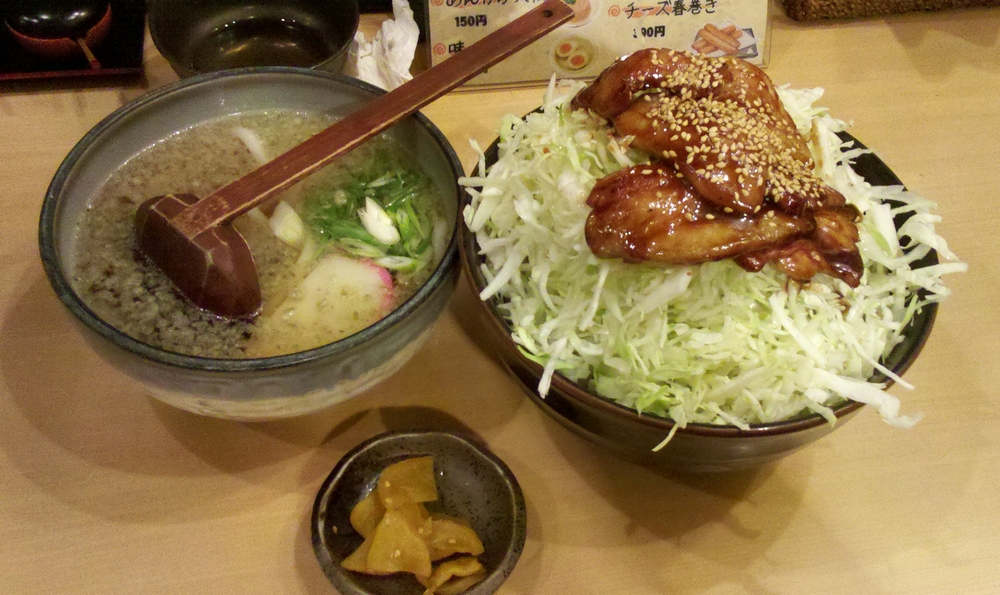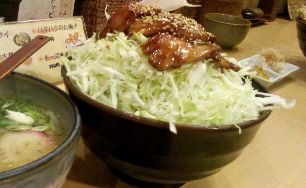 大きな丼の下半分位で、ようやくご飯とご対面。ほとんどがキャベツってことになりますね。