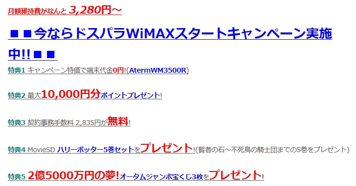 ヨシ!! んじゃ、ADSL を解約して WiMAX に乗り換えるぞ・・・と、意気込んでいたところ、ドスパラから月々が3,280円という格安な WiMAX サービスの発表があったので、ドスパラにも行ってみたのは先週のこと。他のサービス等と比較しつつ、長く使うならお得かな・・・とか、10月にやっているキャンペーンはお得かな・・・と思っていたのですが、色々宣伝文句にだまされました。