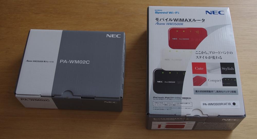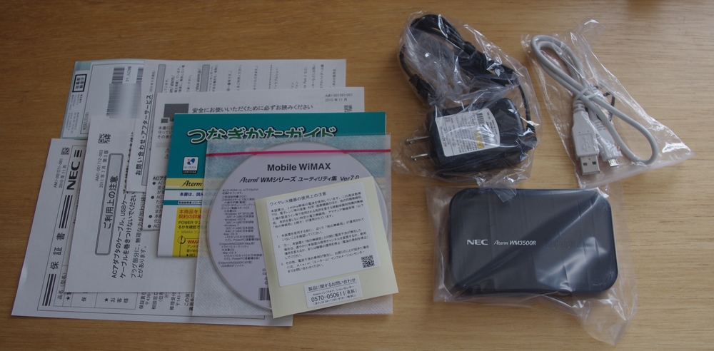 機体は NEC の Aterm WM3500R のクレードルセット。本体代金も無料。契約事務手数料も無料。初月も無料で、配送後7日後が開通日ということで、10/24 に申し込み。10/28 には家に配達されました。そんなわけで、もう使えていますが、10月中と11月は基本料も無料です♪