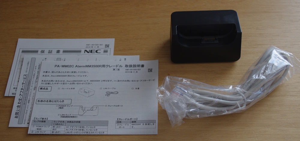 クレードルは別途保証書や説明書、100Base な LAN ケーブルが付属します。