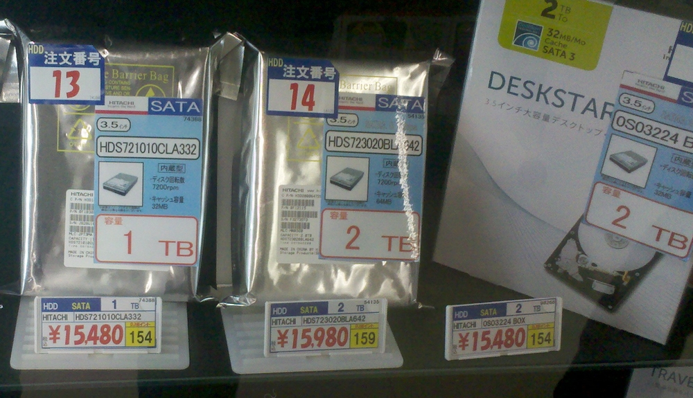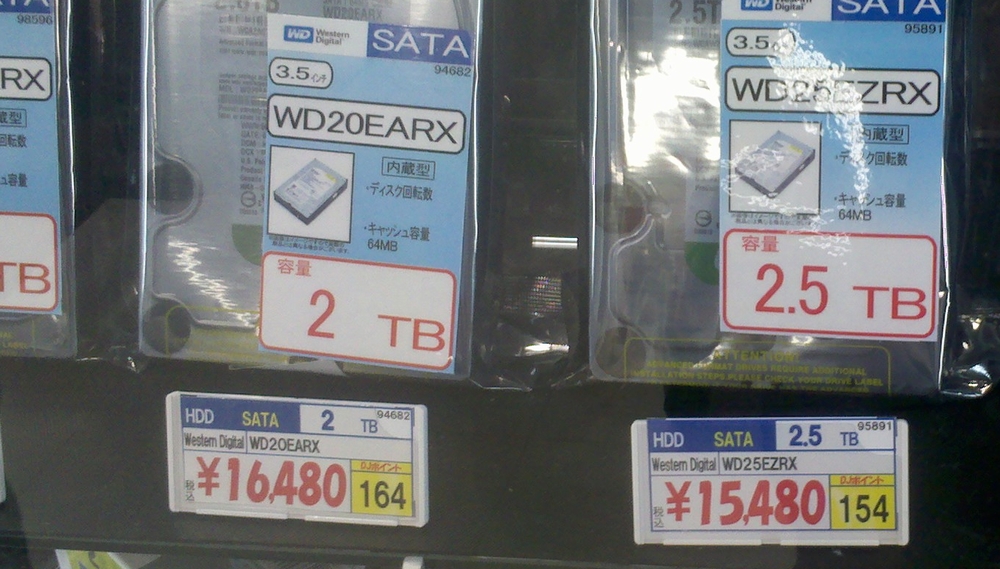 11/2 夕方、横浜のとある PC SHOP の状況。タイで生産しているといわれる Western Digital は、2TB が 16,480 円と、最安値だった頃の3倍以上。2.5TB よりも値段高いし・・・