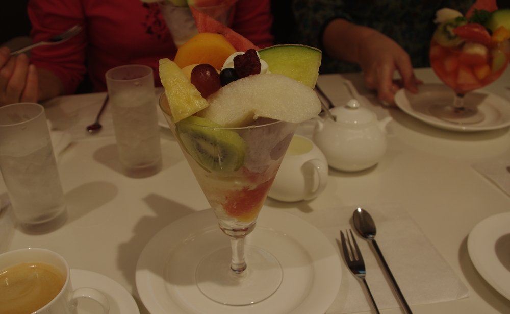 私はフルーツパフェとコーヒーをチョイス。11種類のフルーツに、2種類のシャーベット、バニラアイスなどが入って、ボリュームたっぷり。新鮮なフルーツを色々と楽しめるので、なかなかお勧めです。