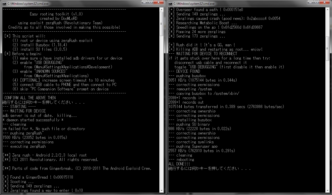 どうやら、新手の Exploit を突いたツールのようで、Gingerbread な Android 一般で使えるという噂もあります。スレのエントリーにも、数多くの成功事例が載っております。