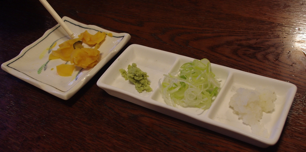 こちらのお通しはお漬物。半ざるなので、薬味は3人分まとまって出てきました。大根おろしがありますねー。
