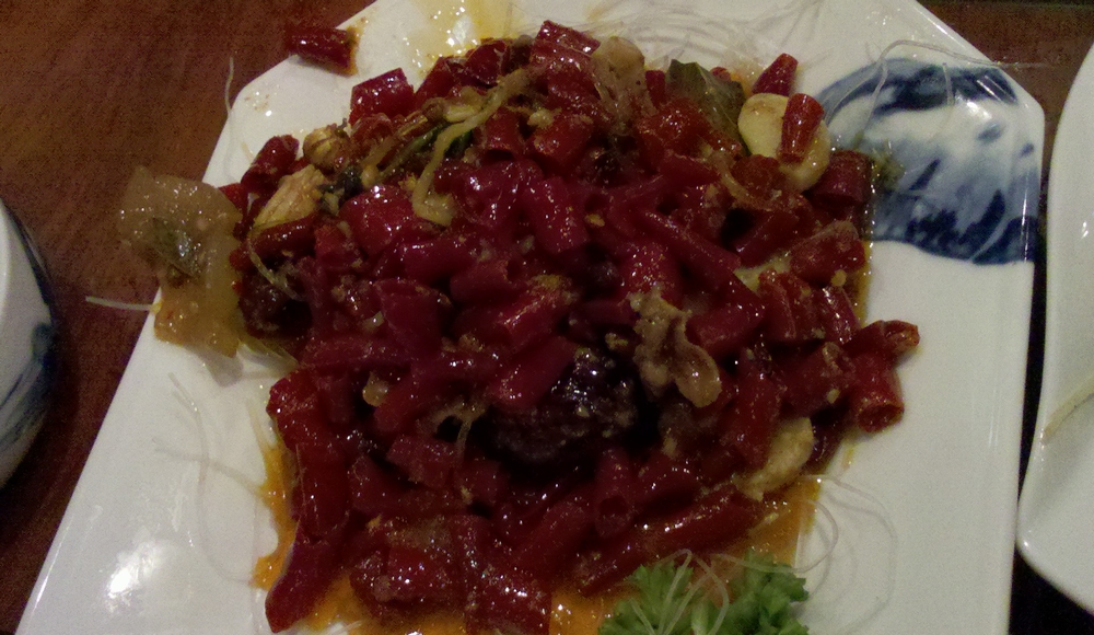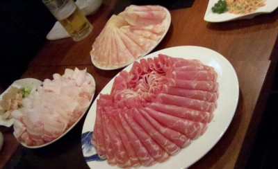 お肉をしゃぶしゃぶしていただきます。うむ、なかなか辛いですよ。皆さんむせ返っておりますが、私は平然とスープ飲んでます(爆)。しかし、スープが飲めるのは最初のうち。徐々に大量の唐辛子から辛いエキスが出てきて、酸味と辛味が時間と共に増加。最後の方はさすがに飲むのはキビシイ状態になっていました。・・・とはいえ、最後は飲んじゃいましたけど。