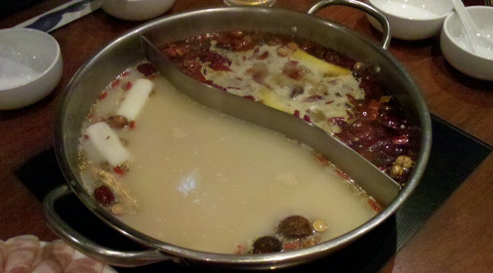 手前が白湯スープ、奥が麻辣スープです。麻辣は辛さが3タイプ選べるのですが、チャレンジャーなH橋様は MAX タイプをチョイス。私は一向に構わないんですけどね~