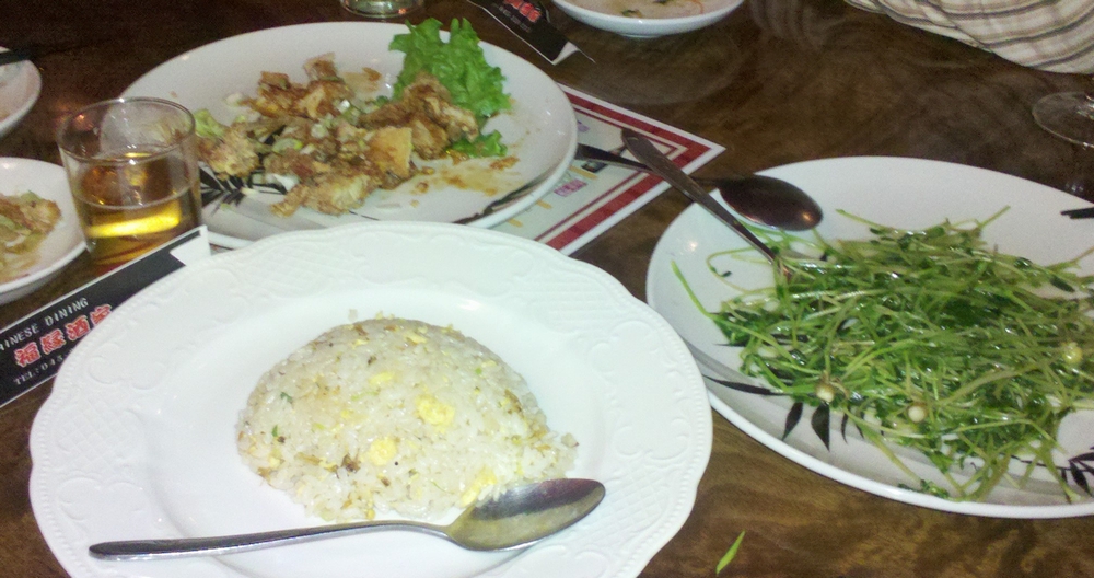 チャーハン、トリモモ肉揚げ香りソース、豆苗とニンニクの炒め、上の写真以外にもチーズ春巻、白身魚の黒酢あんかけなんかが出たのですが、味付けがあまりお好みじゃなかったりして(笑)。