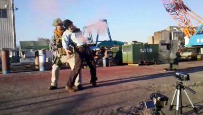 鉄工所の設備もフル活用♪ 私も2役やって、2回とも爆破で飛ばされて死にました(笑)。