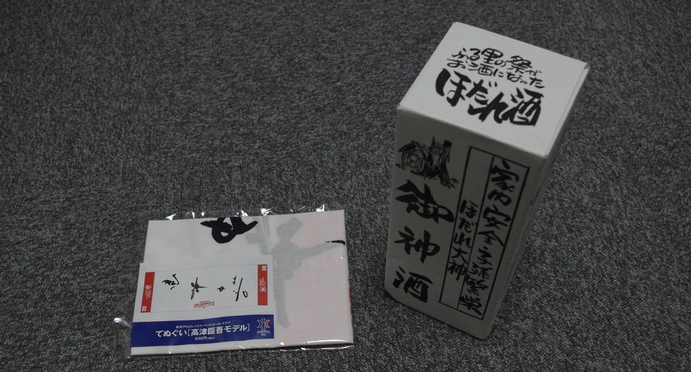 御神酒と手ぬぐい。てぬぐいはアルビレックスの高津選手仕様です♪
